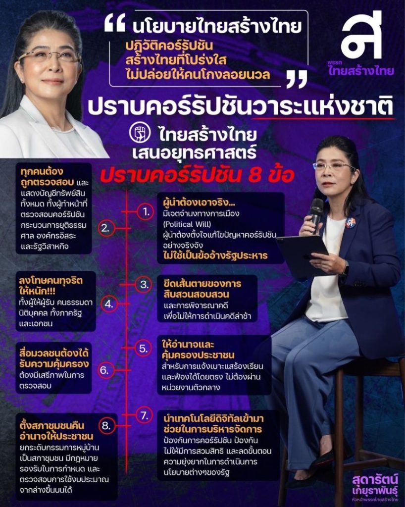ทั้งหมดนี้คือความมุ่งมั่นตั้งใจของพรรคไทยสร้างไทยที่จะขจัดการคอรัปชั่น ที่เป็นมะเร็งร้ายกัดกินประเทศ ทำให้คนไทยยากจนอยู่ทุกวันนี้ให้สำเร็จ