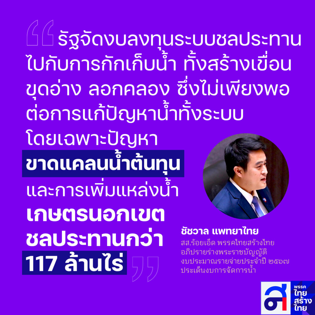 ชัชวาล แพทยาไทย สส.ร้อยเอ็ด พรรคไทยสร้างไทย” ชี้ รัฐจัดงบลงทุนระบบชลประทาน ไปกับการกักเก็บน้ำ ทั้งสร้างเขื่อน ขุดอ่าง ลอกคลอง ซึ่งไม่เพียงพอต่อการแก้ปัญหาน้ำทั้งระบบ โดยเฉพาะการขาดแคลนน้ำต้นทุน รวมถึงการเพิ่มแหล่งน้ำเพื่อการเกษตร นอกเขตชลประทานกว่า 117 ล้านไร่ อาจไม่ได้รับการแก้ไข