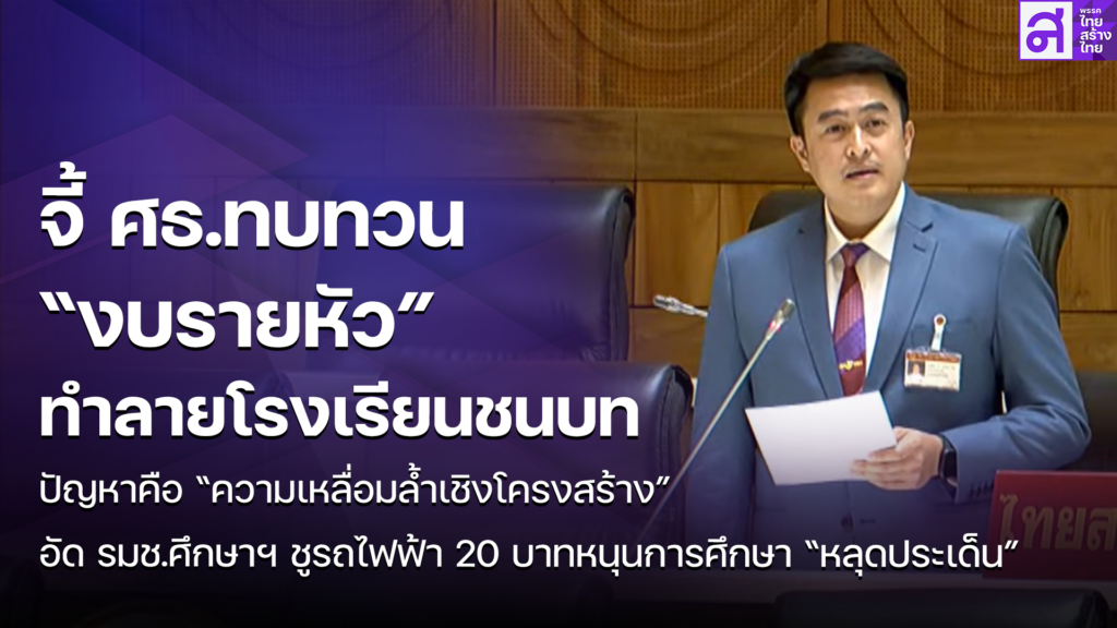เลขาธิการพรรคไทยสร้างไทย ยังตั้งคำถามเชิงนโยบายถึงแผนของกระทรวงศึกษาธิการในการ “ดึงครูส่วนเกินจากโรงเรียนขนาดเล็ก ไปทำหน้าที่ธุรการ” ว่าเป็นเพียงการแก้ปัญหาที่ปลายเหตุ และไม่ใช่แนวทางที่ยั่งยืน พร้อมเสนอให้มีการพิจารณาจัดสรรงบประมาณโดยคำนึงถึงบริบทของพื้นที่ ความยากจน และระยะทาง มากกว่าการนับเพียงจำนวนหัวนักเรียน