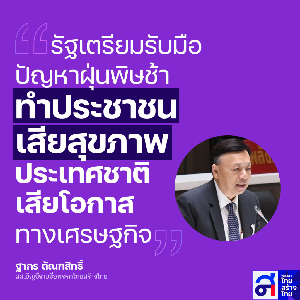 นายฐากร ตัณฑสิทธิ์ สส.บัญชีรายชื่อ พรรคไทยสร้างไทย เรียกร้องรัฐจริงจังแก้ไขปัญหาฝุ่นพิษ โดยทำRoadmap ให้ชัดเจน เนื่องจากทำลายปรสุขภาพประชาชน ประเทศชาติเสียโอกาสทางเศรษฐกิจ พร้อมสนับสนุน พ.ร.บ.อากาศสะอาดภาคประชาชน ขณะเดียวกันยังได้ตั้งคำถามว่าเหตุใดรัฐเตรียมรับมือปัญหาฝุ่นพิษล่าช้า ทั้งที่หลายมาตรการทำได้ตั้งแต่วันแรกที่เข้าทำงาน