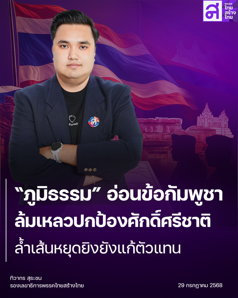 นายทิวากร สุระชน รองเลขาธิการพรรคไทยสร้างไทย แสดงความผิดหวังอย่างรุนแรงต่อการทำหน้าที่ของนายภูมิธรรม เวชยชัย รักษาการนายกรัฐมนตรี โดยระบุว่า การแถลงท่าทีของไทยในเวทีโลกเมื่อวานนี้ในการเจรจากับกัมพูชานั้น อ่อนด้อยจนไม่สามารถปกป้องศักดิ์ศรีและผลประโยชน์ของชาติได้