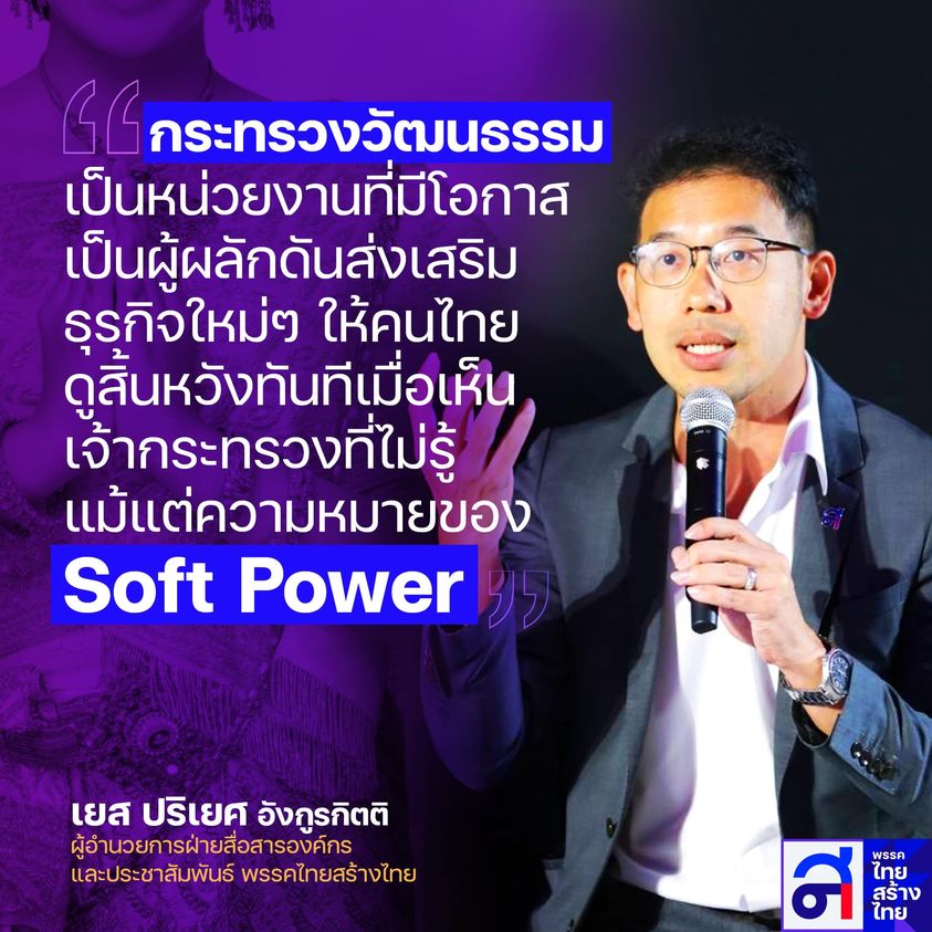 ปริเยศ ไทยสร้างไทย อัดรัฐบาล เอาคนไม่รู้ความหมาย มาคุมเรื่อง soft power หวั่นประเทศเสียโอกาสสร้างรายได้ให้คนไทย แนะเร่งคลอดหน่วยงาน หนุนขายผลงานคนไทยสู่ตลาดโลก