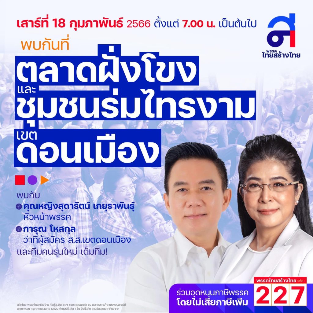 พรรคไทยสร้างไทย นำโดยคุณหญิงสุดารัตน์ เกยุราพันธุ์ หัวหน้าพรรค ,การุณ โหสกุล ว่าที่ผู้สมัครส.ส.เขตดอนเมือง และทีมคนรุ่นใหม่