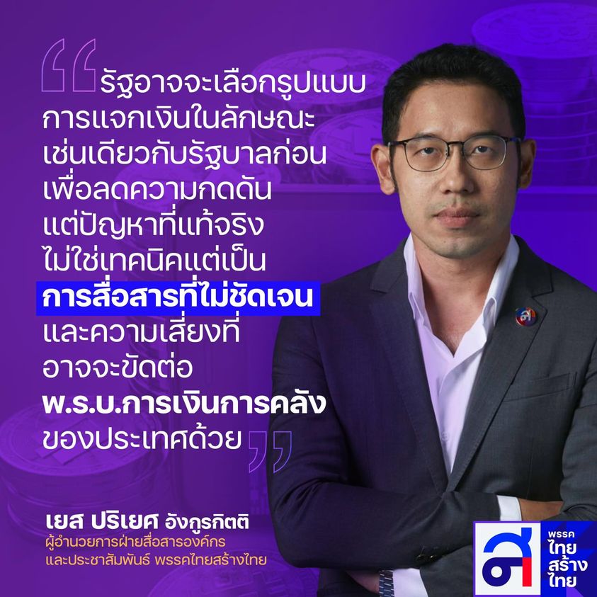 “ผมให้กำลังใจรัฐบาลที่ต้องประสบเหตุการณ์หลายอย่างในช่วงแรกของการบริหารงาน แต่ต้องพูดตรงไปตรงมาว่า นโยบายที่ล่าช้านี้ส่งผลถึงโครงการในหลายๆกระทรวงที่อาจได้รับผลกระทบไปด้วยหากยืนยันเดินหน้านโยบายเงินดิจิตอลอยู่ เนื่องจากต้องกันงบประมาณไว้รองรับจำนวนมาก ผมอยากให้พิจารณาข้อเสนอของไทยสร้างไทยอย่างจริงจังและอย่ามองว่าเป็นข้อเสนอจากฝ่ายค้าน เนื่องจากการให้เครดิตต่อประชาชนแทนเงินดิจิทัล จะทำให้ประชาชนต่อยอดได้มากกว่า และเข้าถึงได้ง่าย และเป็นเงินหมุนเวียนทั้งในส่วนของรัฐและประชาชนได้”