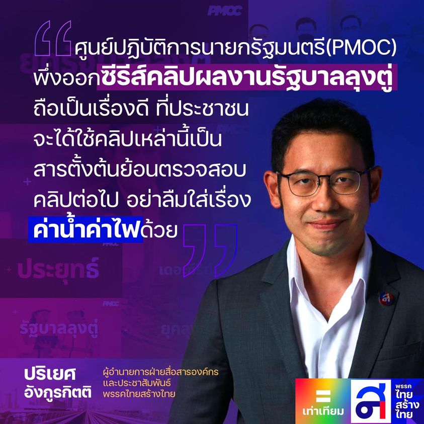 นายปริเยศ อังกูรกิตติ ผู้อำนายการฝ่ายสื่อสารองค์กรและประชาสัมพันธ์ พรรคไทยสร้างไทย กล่าวถึงกรณีศูนย์ปฏิบัตินายกรัฐมนตรี (PMOC) ออกคลิปประชาสัมพันธ์ผลงานรัฐบาลว่า ถือเป็นเรื่องที่เป็นประโยชน์ เพราะทำให้ประชาชนได้มีโอกาสรับรู้ว่ามีเรื่องใดบ้างที่สังคมจะได้ย้อนกลับไปตรวจสอบ