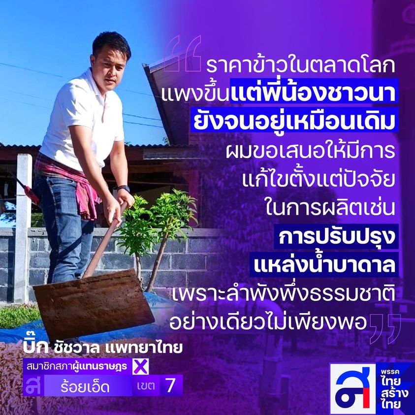 ตอนนี้พี่น้องชาวนาเริ่มเกี่ยวข้าวแล้วแต่ราคาข้าวยังไม่ชัดเจนที่ถึงแม้แนวโน้มราคาข้าวในตลาดโลกสูงขึ้น แต่ราคาข้าวเปลือกหอมมะลิปีนี้บ้านเราอยู่ที่ 11.90 บาทต่อกิโลกรัม สวนทางกับราคาปุ๋ย น้ำมัน อาหารสัตว์ ต้นทุนการผลิตแพงทั้งหมด แต่สินค้าเกษตรของพี่น้องทุกอย่างถูกหมด หมูถูก วัวถูก ปลาถูก กุ้งถูก มีอย่างเดียวที่มีราคาดี คือไส้เดือน 35 บาท ต่อกิโลกรัม หากเป็นอย่างนี้พี่น้องเกษตรกรจะหันไปเลี้ยงไส้เดือนกันหมดครับ ซึ่งนี่สะท้อนว่า มาตรการช่วยพี่น้องเกษตรกรชาวนายังไม่ชัดเจน โครงการประกันรายได้ก็ไม่มี โครงการสินเชื่อชะลอขายข้าวเปลือกนาปี ก็ยังไม่มา พี่น้องเกษตรกรจึงฝากตั้งคำถามมายังรัฐบาลว่า จริงใจในการแก้ไขปัญหาให้พวกเขาหรือไม่