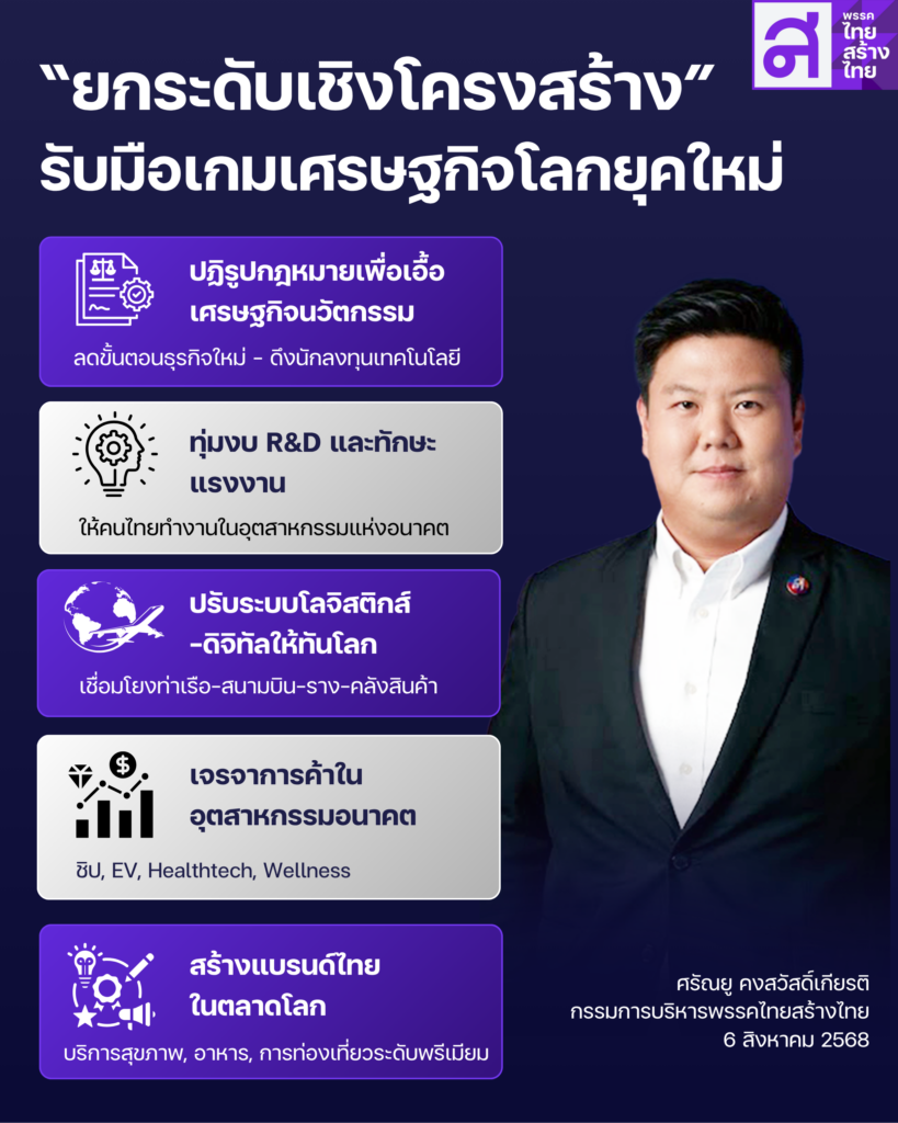 “ศรัณยู ไทยสร้างไทย” ชี้ไทยต้องเร่งยกระดับเชิงโครงสร้าง รับมือเกมเศรษฐกิจโลกยุคใหม่ หลังสหรัฐฯ ขึ้นภาษีนำเข้า 19% เตือนอย่าหวังพึ่งแรงงานราคาถูก-กำไรระยะสั้น