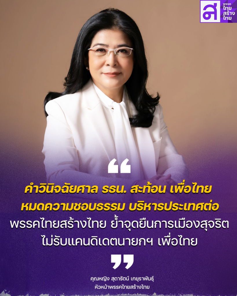 คุณหญิงสุดารัตน์ เกยุราพันธุ์ หัวหน้าพรรคไทยสร้างไทย กล่าวภายหลังศาลรัฐธรรมนูญมีคำวินิจฉัยให้นางสาวแพทองธาร ชินวัตร สิ้นสุดความเป็นนายกรัฐมนตรี โดยระบุว่า คำวินิจฉัยดังกล่าวเป็นสัญญาณชัดเจนว่า พรรคเพื่อไทยและนายกรัฐมนตรีจากพรรคเพื่อไทย ได้หมดความชอบธรรมที่จะอาสามาบริหารราชการแผ่นดินต่อไป เพราะขาดคุณธรรมและจริยธรรมในการดำรงตำแหน่งมาแล้วถึงสองคน ซึ่งสอดคล้องกับจุดยืนของพรรคไทยสร้างไทยที่ยึดมั่นการเมืองสุจริต และคำมั่นที่ให้ไว้กับประชาชนว่าจะรักษาหลักคุณธรรมเป็นสำคัญ