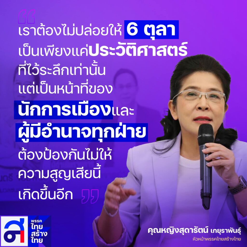 ที่มหาวิทยาลัยสวนดุสิต คุณหญิงสุดารัตน์ เกยุราพันธุ์ หัวหน้าพรรคไทยสร้างไทย ร่วมเสวนาวิชาการ บทเรียน 6 ตุลา การเมือง อำนาจ และความเปลี่ยนแปลง ซึ่งจัดโดย โรงเรียนกฎหมายและการเมืองมหาวิทยาลัยสวนดุสิต โดยกล่าวถึงสถานการณ์ การเมืองในปัจจุบันว่า การเมืองตั้งแต่ในอดีต จนถึงปัจจุบันยังไม่มีการเปลี่ยนแปลงเพื่อพัฒนาไปสู่ประชาธิปไตยแบบสากล