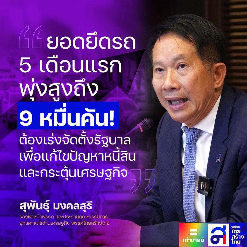 สุพันธุ์ มงคลสุธี รองหัวหน้าพรรค และประธานคณะกรรมการยุทธศาสตร์ด้านเศรษฐกิจพรรคไทยสร้างไทย ออกมาแสดงความกังวลถึงปัญหาหนี้สินและหนี้เสียของประชาชน โดยเฉพาะหนี้รถยนต์