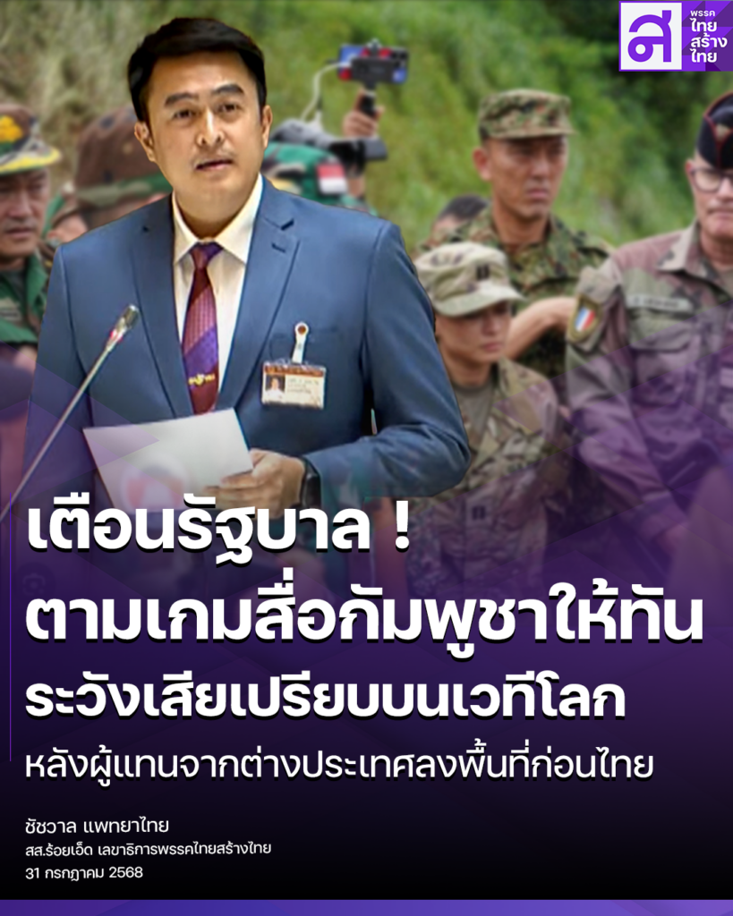 นายชัชวาล แพทยาไทย เลขาธิการพรรคไทยสร้างไทย ให้ความเห็นถึงสถานการณ์ความตึงเครียดบริเวณชายแดนไทย กัมพูชา โดยระบุว่าขณะนี้ประเทศไทยกำลังเสียเปรียบในเวทีการเมืองระหว่างประเทศ แม้ไทยจะมีท่าทีว่ากัมพูชาละเมิดข้อตกลงหยุดยิง แต่ในทางปฏิบัติ กัมพูชาสามารถจัดการสื่อและเชิญผู้แทนจากต่างประเทศลงพื้นที่ก่อน ส่งผลให้ฝ่ายกัมพูชา มีภาพลักษณ์ที่เปิดเผย โปร่งใส และดูไม่ใช่ฝ่ายเริ่มต้นความขัดแย้งในสายตาสังคมโลก