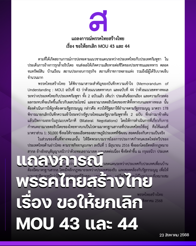 แถลงการณ์พรรคไทยสร้างไทยเรื่อง ขอให้ยกเลิก MOU 43 และ 44