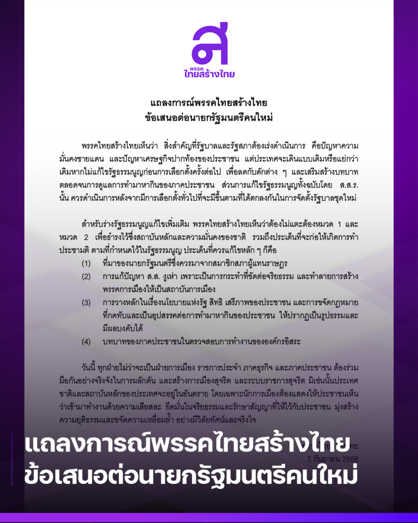 พรรคไทยสร้างไทยเห็นว่า สิ่งสำคัญที่รัฐบาลและรัฐสภาต้องเร่งดำเนินการ คือปัญหาความ