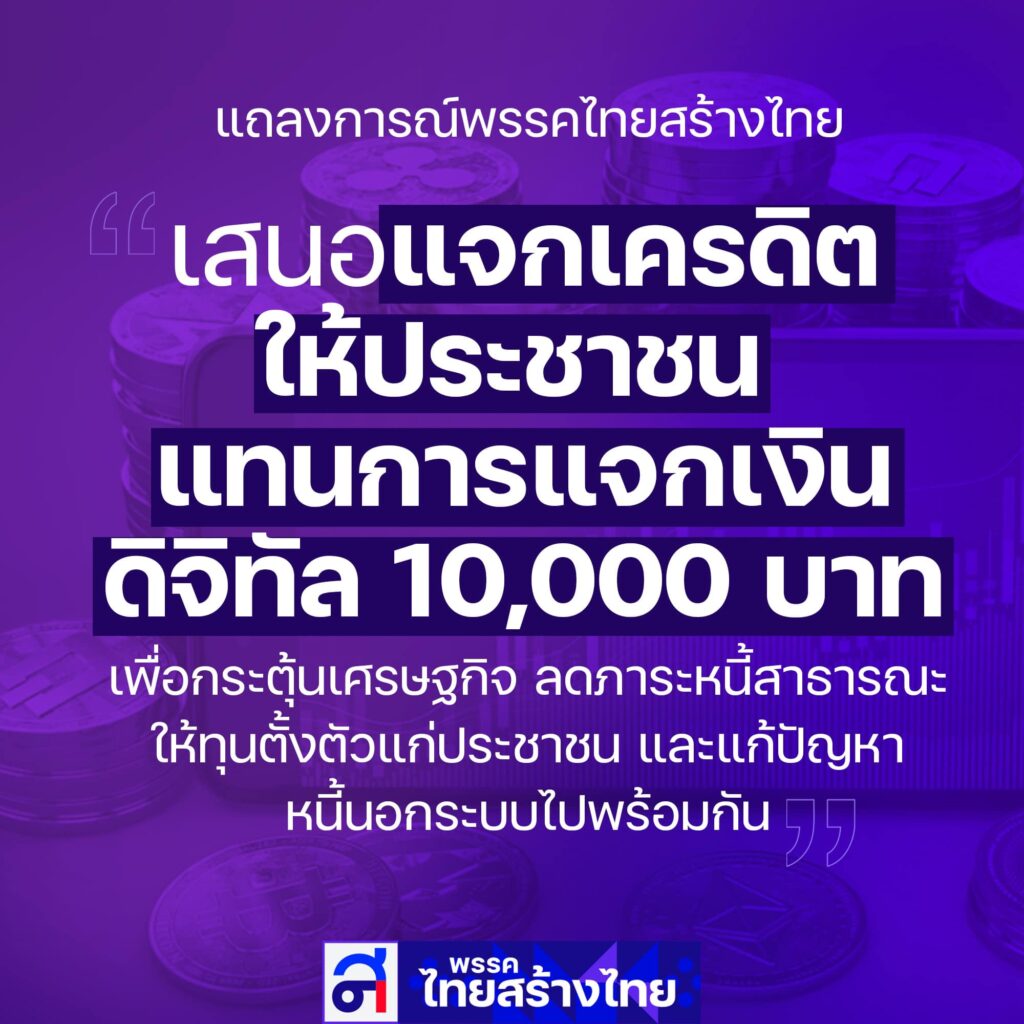 พรรคไทยสร้างไทย ยืนยันมาโดยตลอดว่าการช่วยเหลือและดูแลคนตัวเล็ก และ SMEs เป็นสิ่งที่จำเป็นและต้องรีบทำ เพราะปัจจุบันนี้มีผู้ที่มีรายได้ไม่ถึงเกณฑ์ประมาณ 8 ล้านคน และมีผู้ไม่มีหลักฐานแสดงรายได้ในรูปแบบที่ธนาคารและสถาบันการเงินยอมรับอีกประมาณ 28 ล้านคน ขณะที่ประเทศมี หนี้สินร่วม 10.7 ล้านล้านบาท คิดเป็น 61.3% ของ GDP ต้องจ่ายดอกเบี้ยกว่าปีละ 2 แสนล้านบาท ถ้าจะใช้เงินไม่ว่าด้วยการพิมพ์เพิ่ม หรือกู้เพื่อแจกแบบเหวี่ยงแห ตามโครงการแจกเงินดิจิทัล จะต้องตอบคำถามให้ชัดเจนแบบวิทยาศาสตร์ว่า คุ้มค่าจริงหรือไม่ และหากผลที่ได้รับออกมาไม่เป็นไปตามที่คาดจะรับผิดชอบอย่างไร