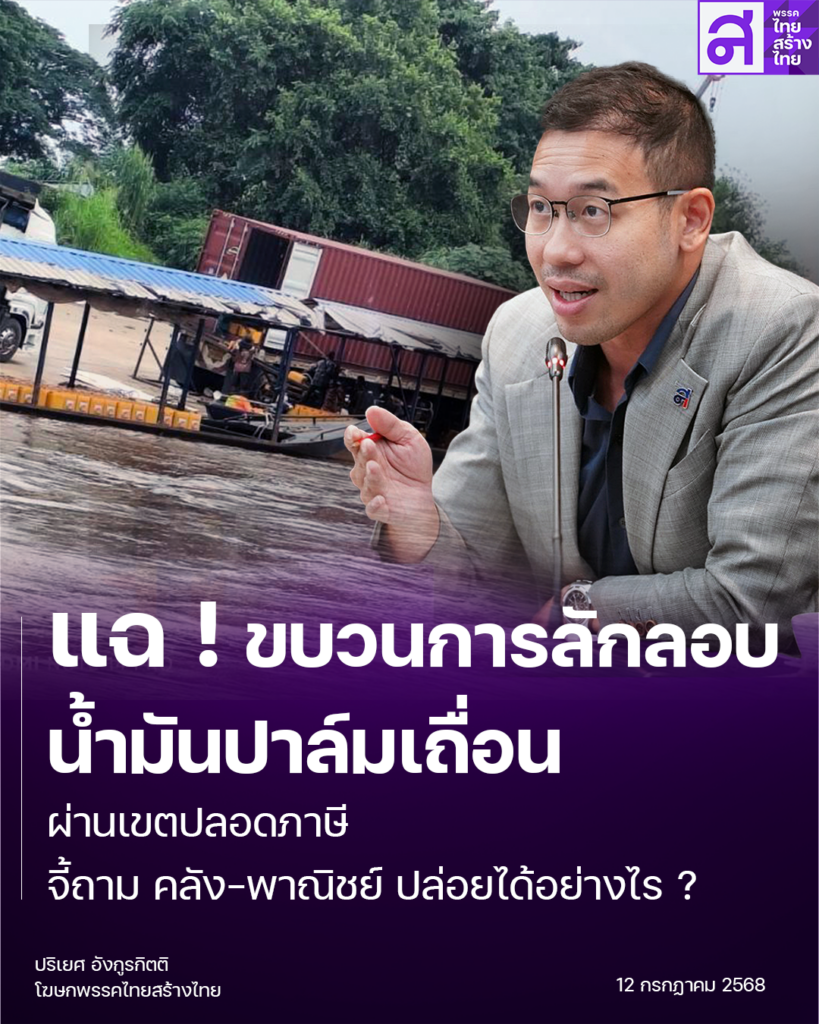 โฆษกพรรคไทยสร้างไทย แฉขบวนการลักลอบนำน้ำมันปาล์มเถื่อนผ่านเขตปลอดภาษีจี้ถาม “คลัง-พาณิชย์” ปล่อยให้เกิดขึ้นได้อย่างไร?