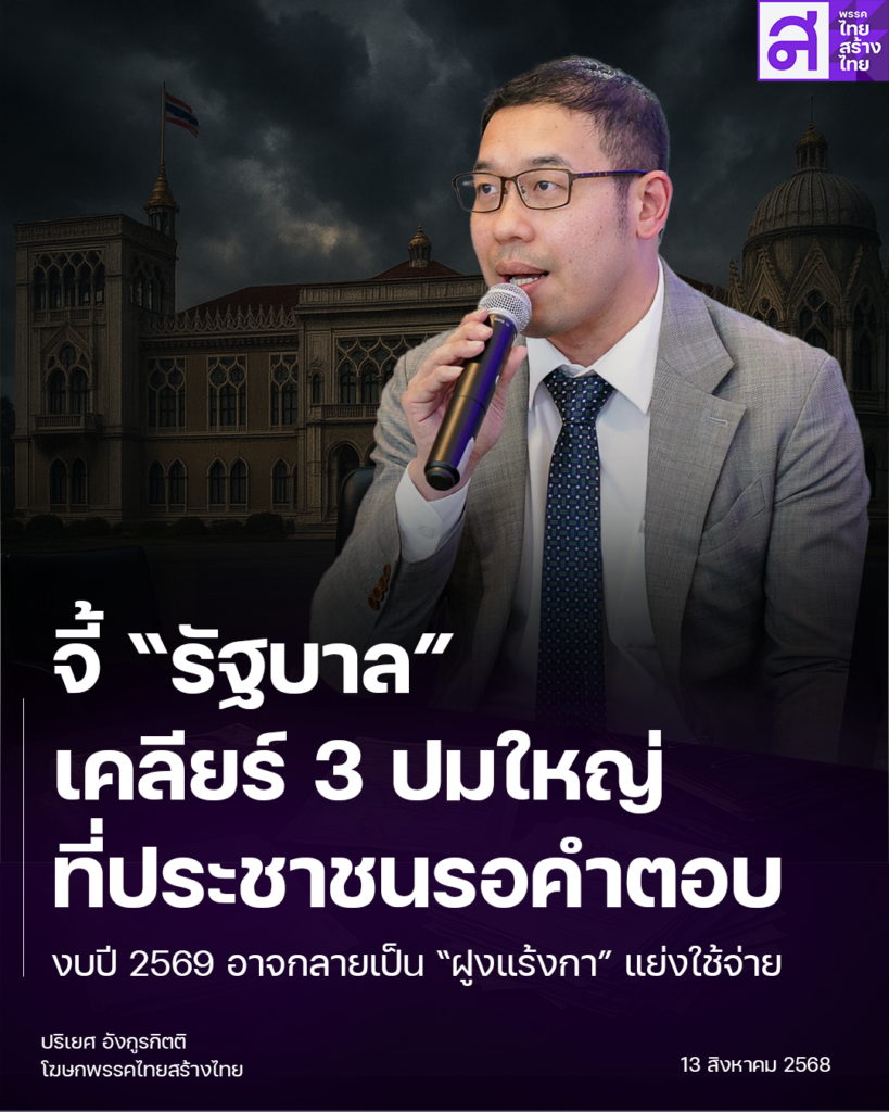 นายปริเยศ ระบุว่า ขณะนี้รัฐบาลมุ่งแต่จัดกิจกรรมและอีเวนท์ต่างๆ ให้ทันสิ้นปีงบประมาณ กระทรวงต่างๆ พากันเร่ง “ตัดริบบิ้น” เปิดงาน แต่กลับไม่มีผลงานที่เป็นรูปธรรม ขณะที่งบประมาณปี 2569 หากผ่านสภา ก็อาจกลายเป็นเหมือน “ฝูงแร้งกา” แย่งกันใช้จ่าย โดยไม่มีการวางแผนปรับโครงสร้างเพื่อรับมือปัญหาเศรษฐกิจครั้งใหญ่ที่กำลังจะมาถึง