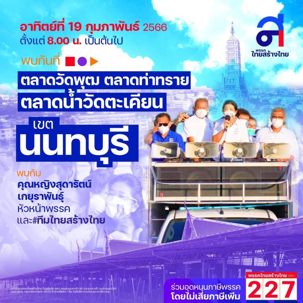 พี่น้องชาวนนทบุรี เตรียมพบกับ คุณหญิงสุดารัตน์ เกยุราพันธุ์ หัวหน้าพรรค และทีมไทยสร้างไทย ณ ตลาดวัดพุฒ ตลาดท่าทราย และตลาดน้ำวัดตะเคียน