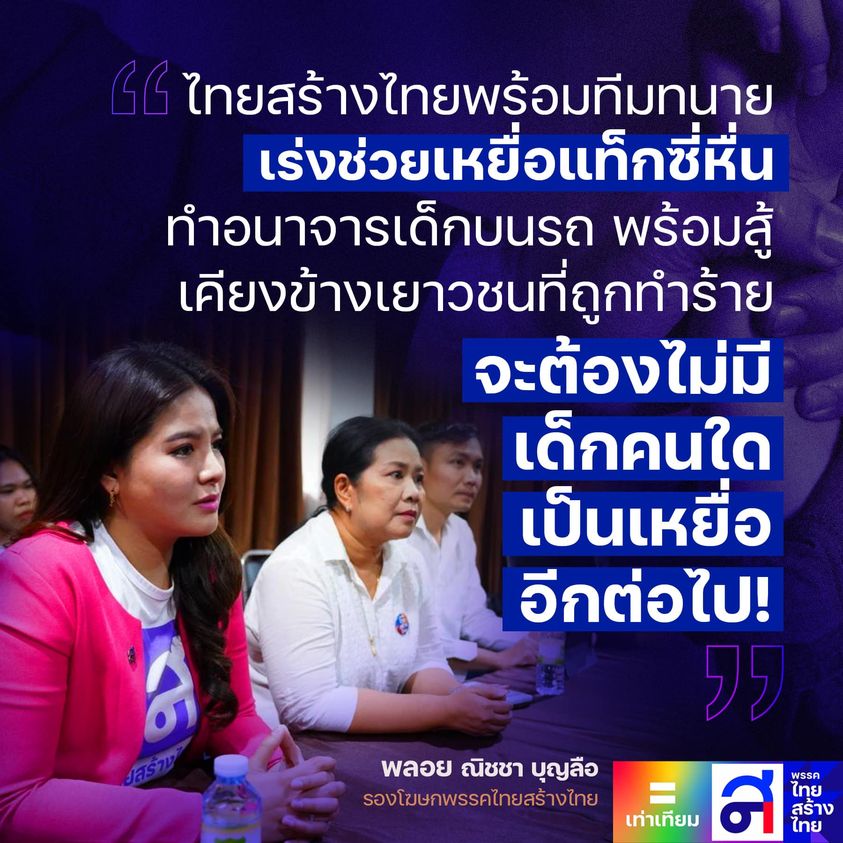 คุณหญิงสุดารัตน์ เกยุราพันธุ์ หัวหน้าพรรคไทยสร้างไทย มอบหมายให้นางสาวณิชชา บุญลือ รองโฆษกพรรคไทยสร้างไทย พร้อมทีมทนายความ นำผู้เสียหาย ที่ถูกล่วงละเมิดโดยการกระทำอนาจารบนรถแท็กซี่ เดินทางเข้าแจ้งความต่อพนักงานสอบสวน สถานีตำรวจภูธรประตูน้ำจุฬาลงกรณ์ อำเภอธัญบุรีจังหวัดปทุมธานี เพื่อช่วยเด็กเยาวชนถูกทำอนาจารบนรถแท็กซี่