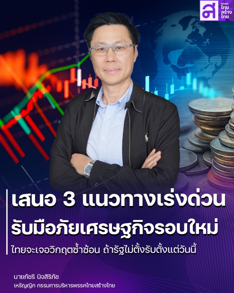 - ออกมาตรการสนับสนุนประชาชนและธุรกิจรายย่อย เช่น การพักชำระหนี้ สินเชื่อดอกเบี้ยต่ำ และโครงการลดค่าครองชีพในช่วงวิกฤต “วิกฤตเศรษฐกิจที่กำลังมาถึงไม่อาจเลี่ยงได้ แต่เราสามารถเตรียมรับมือได้ ถ้ารัฐบาลจริงจังและเริ่มตั้งแต่วันนี้” นายภัชริ กล่าว