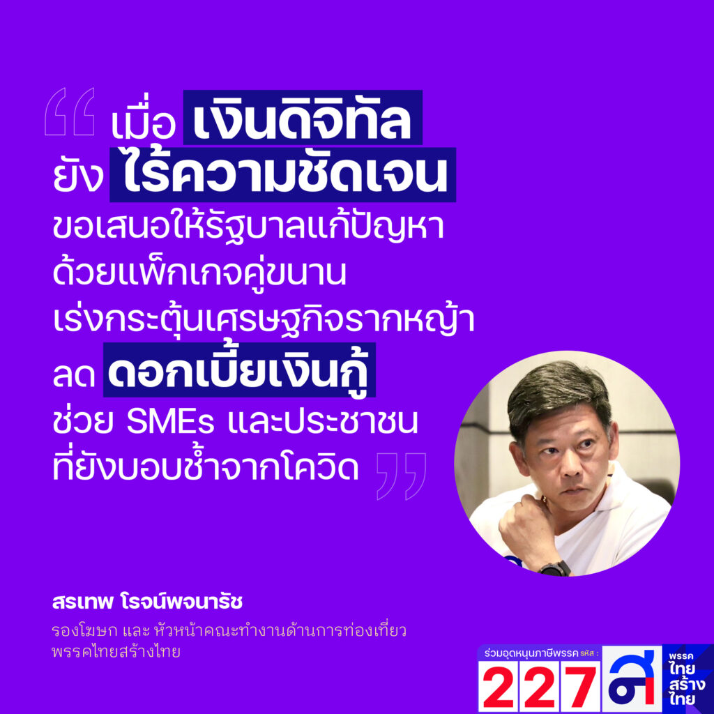 จึงขอแนะให้นายกรัฐมนตรี เร่งกระตุ้นเศรษฐกิจรากหญ้าก่อนจะดำเนินนโยบายแจกเงินดิจิทัล ซึ่งยังไม่มีความชัดเจนว่า จะเกิดขึ้นได้จริงหรือไม่ หรือเมื่อเกิดขึ้นแล้ว ก็อาจไปเอื้อประโยชน์ให้ทุนใหญ่มากกว่าประชาชนหรือไม่