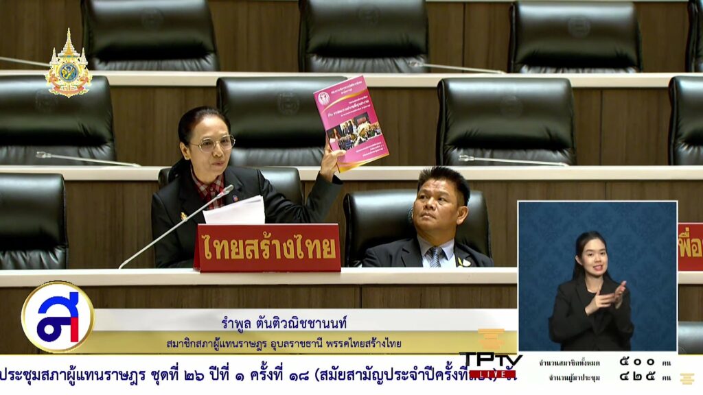 นางรำพูล ตันติวนิชชานนท์ สส.อุบลราชธานี พรรคไทยสร้างไทย กล่าวสนับสนุน รายงานผลการพิจารณาศึกษา เรื่องการพัฒนาระบบบำนาญพื้นฐานประชาชนซึ่งสอดคล้องกับนโยบายของพรรคไทยสร้างไทย ที่ได้ประกาศเดินหน้านโยบายบำนาญประชาชนและเสนอกฎหมายเข้าสู่การพิจารณาของสภาผู้แทนราษฎรแล้ว ตั้งแต่เดือนสิงหาคม ปี 2565ที่ผ่านมา ซึ่งสภารับไว้พิจารณา แต่เนื่องจากกฎหมายดังกล่าวเป็นพ.ร.บ.ที่เกี่ยวข้องกับการเงินจึงต้องส่งให้คณะรัฐมนตรีเป็นผู้พิจารณา แต่ถึงปัจจุบันก็ยังไม่มีความชัดเจน สะท้อนถึงความไม่ใส่ใจในการรับมือสังคมผู้สูงวัยที่ประเทศกำลังเผชิญหรือไม่