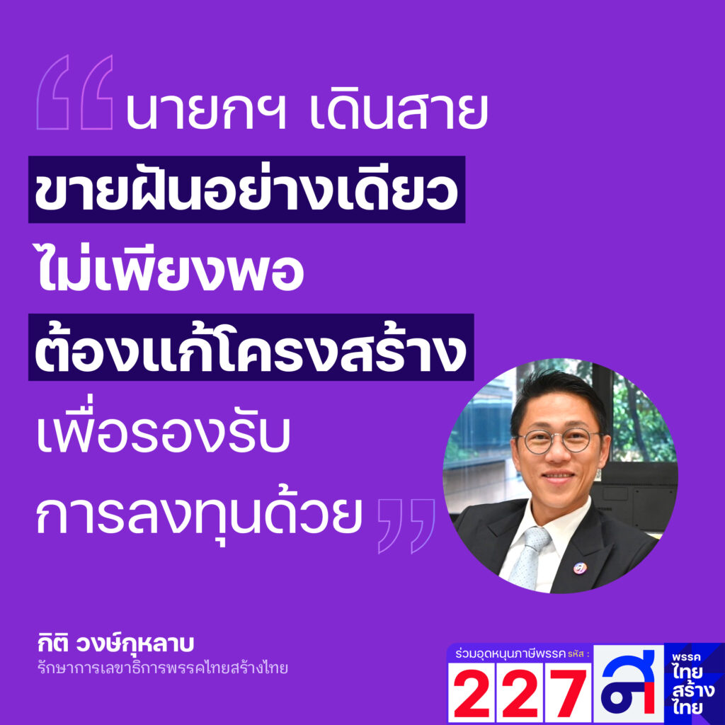 นายกิติ วงษ์กุหลาบ รักษาการเลขาธิการพรรคไทยสร้างไทย กล่าวถึงการเดินทางไปต่างประเทศ เพื่อปฏิบัติภารกิจของนายกรัฐมนตรี ซึ่งจากการติดตามการทำงานพบว่า นับแต่เข้ารับตำแหน่ง จนถึงวันนี้ นายกรัฐมนตรีเดินทางไปต่างประเทศเกินกว่า 50 วัน มีการเจรจากับทั้งภาครัฐและเอกชนมากมาย แต่คนไทยกลับยังไม่เห็นความสำเร็จที่เป็นรูปธรรม โดยเฉพาะการลงทุนที่เกิดขึ้นจริงแม้แต่รายเดียว