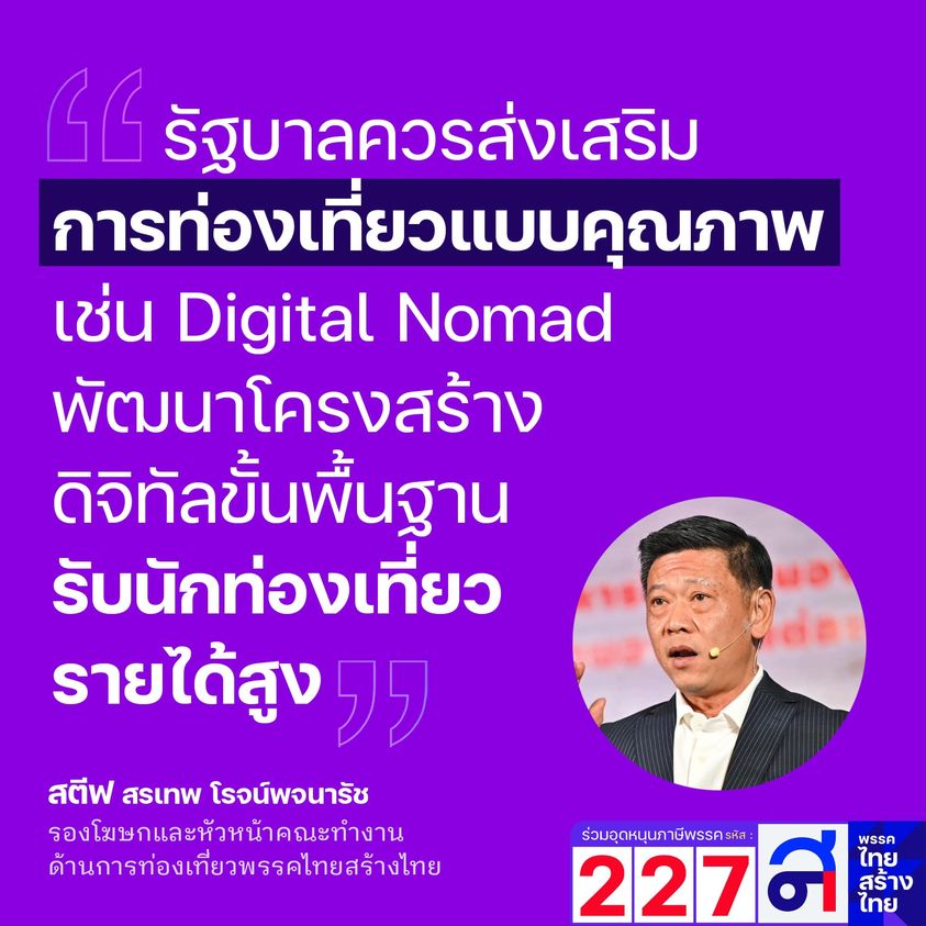 นายสรเทพ โรจพจนารัช รองโฆษก และคณะทำงานด้านการท่องเที่ยว พรรคไทยสร้างไทย กล่าวถึง การท่องเที่ยวของประเทศไทย โดยแนะนำรัฐบาลว่า นอกจากปริมาณนักท่องเที่ยว ที่รัฐบาลให้ความสำคัญแล้ว ยุทธศาสตร์ในการดึงนักท่องเที่ยวเชิงคุณภาพก็มีความสำคัญไม่แพ้กัน จึงขอเรียกร้องให้รัฐส่งเสริมการทำทัวร์คุณภาพ พร้อมกับการสร้างตลาดนักท่องเที่ยวใหม่ๆให้เกิดขึ้นอย่างจริงจัง เช่น Digital Nomad