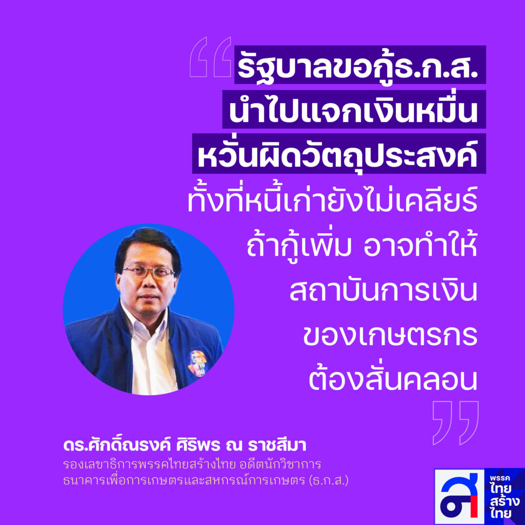ไทยสร้างไทย ชี้ รัฐขอกู้ ธกส.แจกเงินดิจิทัล 10,000บาท ส่อผิดวัตถุประสงค์ ระบุ หนี้จำนำข้าวยังจ่ายไม่ครบ แต่มาแจก 10,000บาทเพิ่ม อาจดึงสถาบันการเงิน ของพี่น้องเกษตรกร เข้าสู่ภาวะความเสี่ยงด้านสภาพคล่อง กระทบต่อรายได้และเงินกองทุนของธนาคารทั้งในปัจจุบันและอนาคต