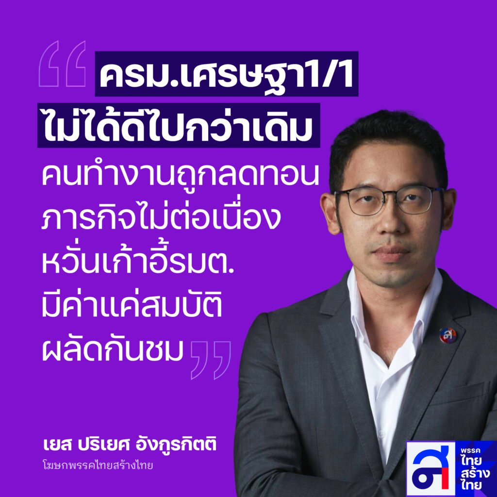 นายปริเยศ อังกูรกิตติ โฆษกพรรคไทยสร้างไทย ตั้งข้อสังเกตถึงการปรับคณะรัฐมนตรีเศรษฐา 1/1โดยชี้ว่า ครม.ชุดนี้ คงเข้ามาทำงานโดยมุ่งเน้นไปที่งบประมาณเป็นหลัก ทั้งการโยกย้ายบุคคลที่พอทำผลงานได้ไปไว้ที่อื่น รวมถึงการถอดบางบุคคลออกจากตำแหน่งอย่างง่ายดายกว่าที่คาดไว้ นอกจากนี้ยังมีการแลกเปลี่ยนตำแหน่งเพื่อการดูแลแบบเบ็ดเสร็จในบางกระทรวงสำคัญ สิ่งเหล่านี้สะท้อนให้เห็นว่าครม.ชุดนี้ มุ่งเน้นไปที่การบริหารงบประมาณในช่วงระยะเวลาสั้นๆและตอบโจทย์การเมือง โดยเฉพาะการจัดสรรตำแหน่งตามกลุ่มก๊วนที่สนับสนุนรัฐบาลมากกว่า เป้าหมายการพัฒนาประเทศและปัญหาของประชาชน