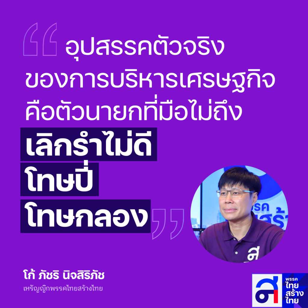 นายภัชริ นิจสิริภัช เหรัญญิกพรรคไทยสร้างไทยกล่าวถึงเศรษฐกิจของไทยที่ชะลอตัว เครื่องยนต์สำคัญทางเศรษฐกิจ เช่นการส่งออกกลับมาติดลบ จนมีการกล่าวโทษโยนความผิดกันเกิดขึ้นนั้น ตนมองว่าคนที่เป็นอุปสรรคในการแก้ไขปัญหาเศรษฐกิจของประเทศ ไม่ใช่ผู้ว่าการธนาคารแห่งประเทศไทย แต่คือตัวนายเศรษฐา ทวีสิน นายกรัฐมนตรี ที่ยังมือไม่ถึงด้านเศรษฐกิจ คำประกาศหรือนโยบาย ที่ได้หาเสียงและแถลงไว้ต่อรัฐสภาไม่สามารถปฏิบัติตามได้ ไม่ว่าจะเป็นเรื่องของการลดรายจ่าย เพิ่มรายได้ ให้คนไทย
