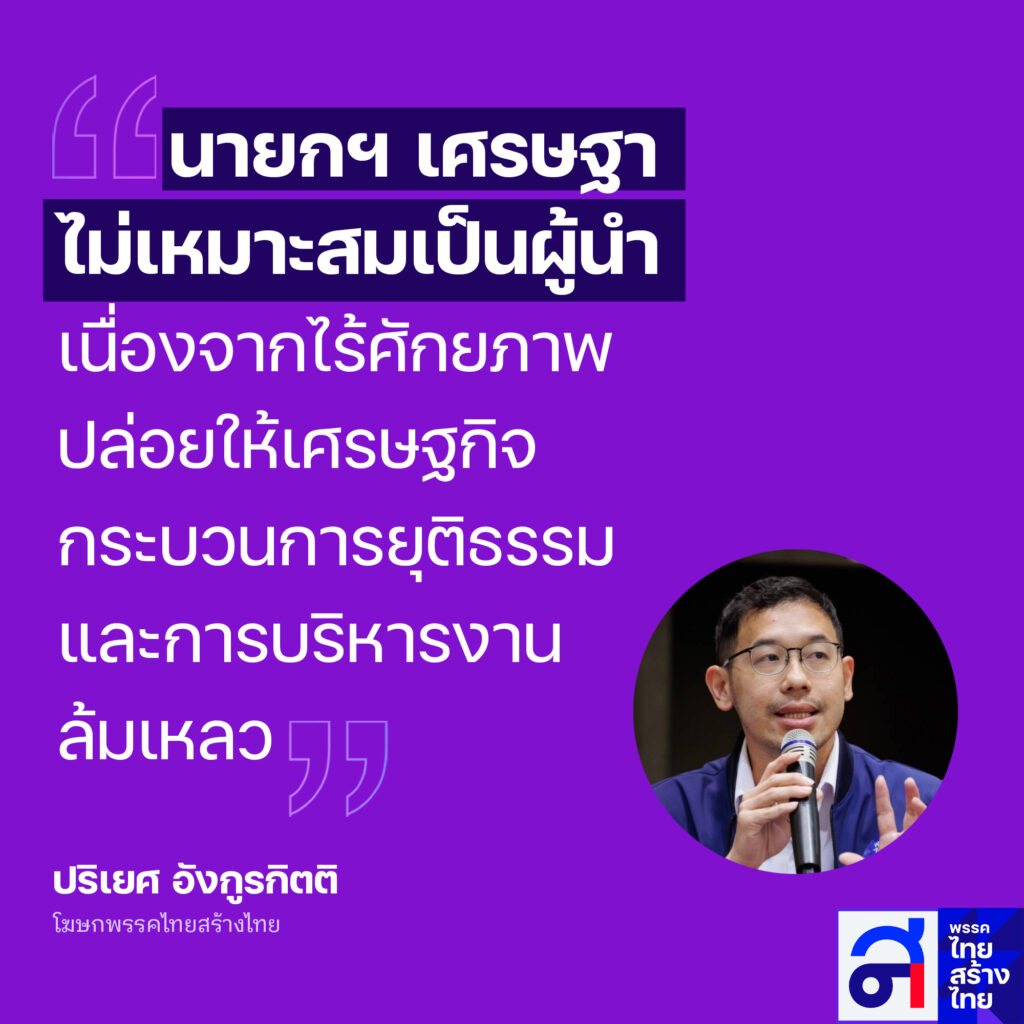 นายปริเยศ อังกูรกิตติ โฆษกพรรคไทยสร้างไทย กล่าวถึงการบริหารราชการแผ่นดินของนายกรัฐมนตรี โดยเฉพาะบทบาทความเป็นผู้นำ ซึ่งหลายครั้งนำมาสู่การทำงานที่ขาดประสิทธิภาพ ไม่สามารถแก้ไขปัญหาให้ประชาชนได้ตรงจุด ที่สำคัญจะเห็นว่าการตัดสินใจของนายกรัฐมนตรีไม่ตรงกับที่ได้ให้คำมั่นกับพี่น้องประชาชน ทั้งด้านเศรษฐกิจ กระบวนการยุติธรรม การบริหารงานราชการ หรือการขาดความเป็นอิสระในการตัดสินใจสำคัญทางการเมือง เช่น