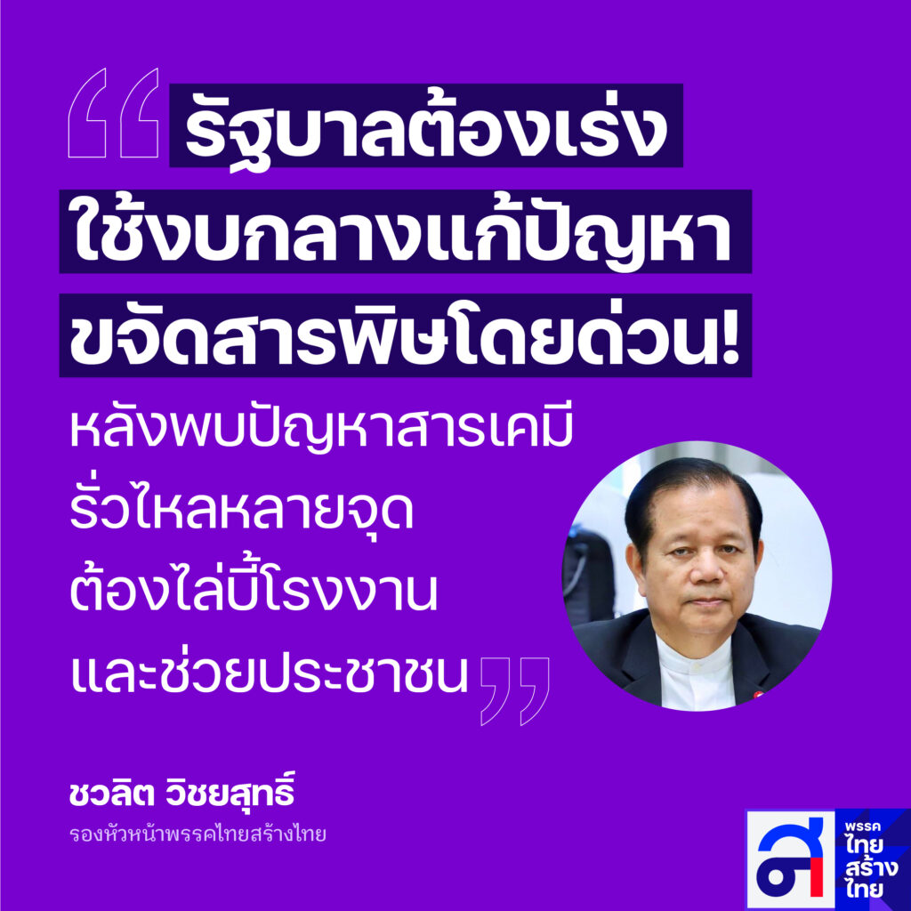 นายชวลิต วิชยสุทธิ์ รองหัวหน้าพรรคไทยสร้างไทย และกรรมาธิการงบประมาณปี 2567 ชื่นชมสื่อมวลชนที่เกาะติดข่าวโรงงานอุตสาหกรรมแห่งหนึ่งใน จ.ระยอง และโรงงานในเครือที่จ.พระนครศรีอยุธยา ลักลอบทิ้งสารเคมีโดยไม่ผ่านการบำบัด ณ บริเวณพื้นที่โรงงาน ทั้งในดินและไหลไปตามลำน้ำสาธารณะ ล่าสุดมีการตรวจพบนำสารเคมีร้ายแรงที่ไม่ผ่านการบำบัดไปลักลอบทิ้งที่ “กลางดง” นครราชสีมา ตนเห็นว่าเรื่องนี้เป็นเรื่องร้ายแรงมาก แต่รัฐบาลกลับดำเนินการแก้ไขล่าช้ามาก