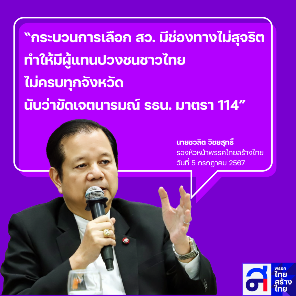 นายชวลิต วิชยสุทธิ์ รองหัวหน้าพรรคไทยสร้างไทย ให้ความเห็นต่อการเลือก ส.ว.ที่เป็นประเด็นอยู่ในขณะนี้ว่า รธน.มาตรา 114 บัญญัติให้ สส.และ สว. “เป็นผู้แทนปวงชนชาวไทย” แต่การเลือก สว.ที่ผ่านมา มีจังหวัดที่ไม่ได้ สว.มากถึง 9 จังหวัด (รวมจำนวนประชากรหลายล้านคน) แสดงว่า กระบวนการเลือกมีช่องทางไม่สุจริต จนทำให้ไม่มี สว.ซึ่งเป็นผู้แทนปวงชนชาวไทยครบทุกจังหวัด นับว่าขัดเจตนารมณ์ รัฐธรรมนูญ มาตร 114 อย่างแน่นอน