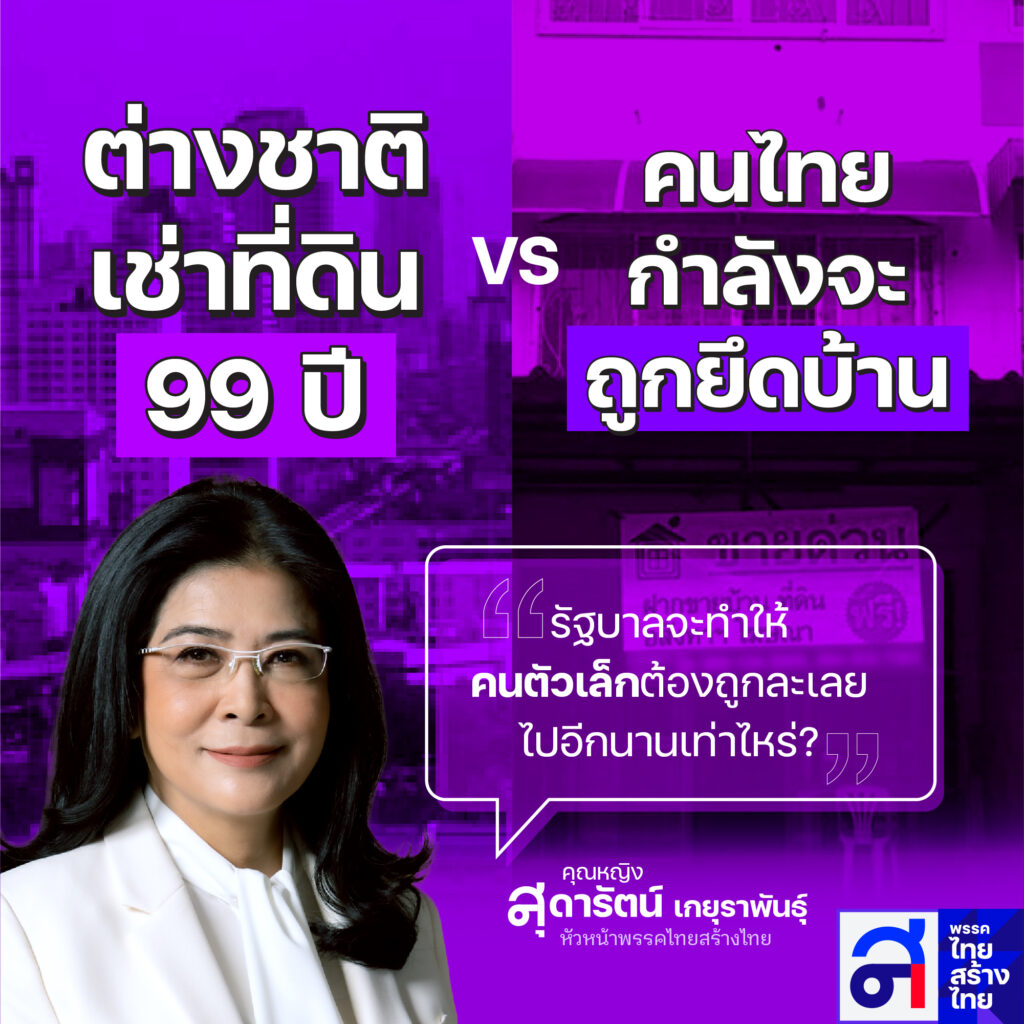 คุณหญิงสุดารัตน์ เกยุราพันธุ์ หัวหน้าพรรคไทยสร้างไทย กล่าวถึงกรณีที่มีการสั่งการด่วนให้รัฐมนตรีว่าการกระทรวงมหาดไทย ศึกษามาตรการกระตุ้นเศรษฐกิจผ่านภาคอสังหาริมทรัพย์ และเตรียมการเพื่อรองรับการดำเนินการยกระดับประเทศไทยสู่ศูนย์กลางเมืองแห่งอุตสาหกรรมระดับโลก (Thailand Vision) โดยจะปรับแก้กฎหมายให้ชาวต่างชาติเช่าที่ดินได้นานขึ้นจาก 50 ปี เป็น 99 ปี และถือกรรมสิทธิ์ห้องชุด เพิ่มสัดส่วนจาก 49% เป็น 75%ว่า การให้ต่างชาติเช่าที่ดิน 99 ปี กับการที่ คนไทยต้องถูกยึด“บ้าน”อะไรสำคัญและต้องแก้ไขอย่างเร่งด่วนมากกว่ากัน โดยเฉพาะสถานการณ์ ในปัจจุบัน ไม่ว่าจะไปที่ไหน จะเป็นวงนักธุรกิจหรือไปเดินตลาดทุกคนต่างพูดเป็นเสียงเดียวกันว่า “เศรษฐกิจแย่ รายได้ลด แต่ของแพงทั้งแผ่นดิน”