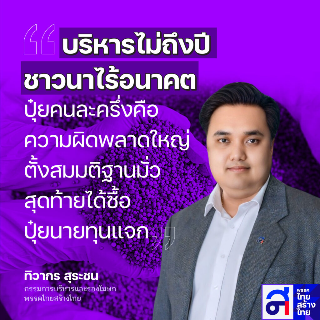 นายทิวากร สุระชน รองโฆษกพรรคไทยสร้างไทย กล่าวถึงโครงการปุ๋ยคนละครึ่ง โดยระบุว่า เมื่อรัฐบาล ไม่ฟังเสียงทักท้วงจากประชาชน สุดท้ายนโยบายนี้จะกลายเป็นอีกหนึ่งความผิดพลาดของรัฐบาล เริ่มตั้งแต่การตั้งสมมติฐานเรื่องราคาข้าวที่ผิดพลาด โดยกล่าวอ้างว่าราคาข้าวในปีการผลิต 2567/2568 ดีกว่าหลายปีที่ผ่านมา ทั้งที่ราคาที่สูงอยู่ประมาณ 12,000-13,000 บาทต่อตันตอนนี้เป็นราคาที่เกษตรกรพี่น้องชาวนาไม่มีข้าวอยู่ในมือ ไม่สามารถนำข้าวออกขายได้ แต่เมื่อสิ้นสุดฤดูกาลผลิต ข้าวที่ชาวนาเพาะปลูกออกพร้อมกัน ราคาก็จะตกลงเหลือเพียง8,000-9,000บาท เท่านั้น ซึ่งเป็นราคาที่ไม่คุ้มกับต้นทุนการผลิต ดังนั้นการใช้ยุทธศาสตร์ที่ผิดพลาดเช่นนี้ ทำให้ความหวังของชาวนา ที่จะได้เงินช่วยค่าเก็บเกี่ยวไร่ละ 1,000บาท จึงหายไป