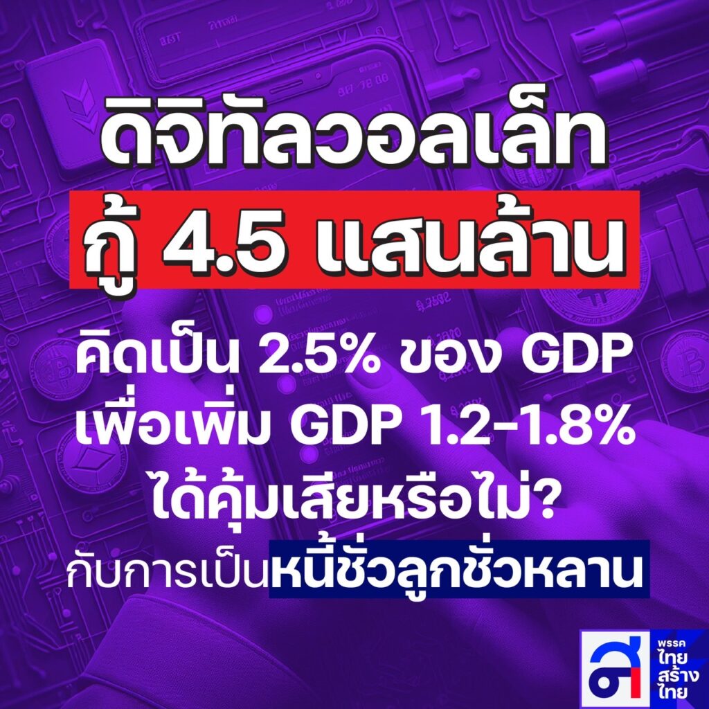 หัวหน้าพรรคไทยสร้างไทยเห็นว่า เงินที่จะกู้มาแจกถึง 450,000 ล้านบาทนั้น เท่ากับ 2.5% ของ GDP แต่รัฐบาลบอกว่าจะสามารถ เพิ่ม GDP ได้ 1.2-1.8% และจะเป็นการโตเพียงช่วงสั้นๆ เพราะเป็นการแจกเงิน ที่ใช้แล้วหมดไป ไม่ก่อให้เกิดการสร้างงาน สร้างรายได้ หรือปรับโครงสร้างเศรษฐกิจที่ยั่งยืน จึงทำให้เกิดความห่วงใยว่า โครงการนี้ได้ไม่คุ้มเสีย เพราะเงินกู้จำมหาศาล จะกลายเป็นภาระหนี้ให้กับประเทศ และคนไทยไป ชั่วลูกชั่วหลาน