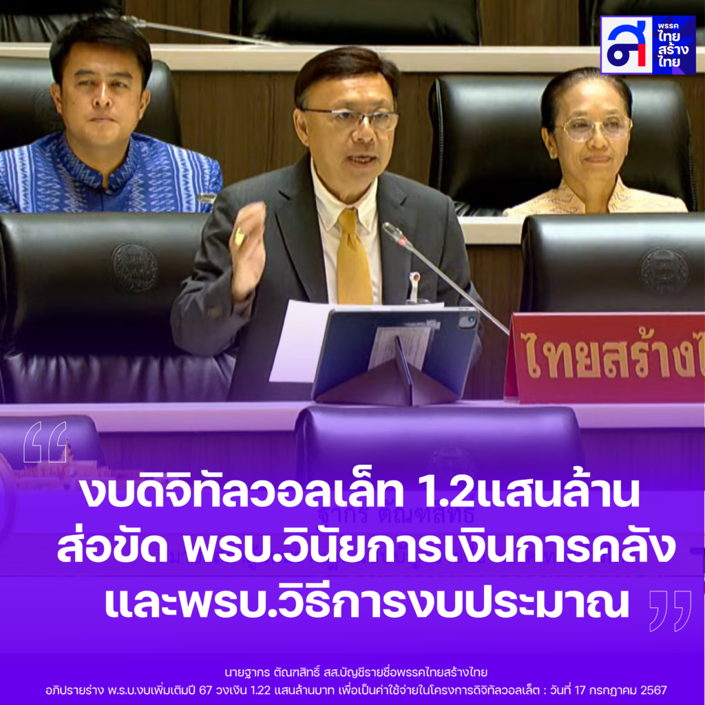 นายฐากร ตัณฑสิทธิ์ สส.บัญชีรายชื่อ พรรคไทยสร้างไทย อภิปรายร่างพระราชบัญญัติงบประมาณรายจ่ายเพิ่มเติมปี 2567 เพื่อขออนุมัติงบประมาณวงเงิน 1.22 แสนล้านบาทเพื่อนำไปทำโครงการดิจิทัล วอลเล็ท แจก10,000 บาทว่า