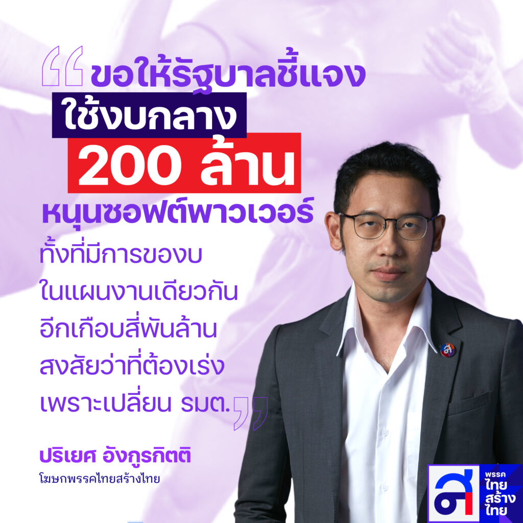 นายปริเยศ อังกูรกิตติ โฆษกพรรคไทยสร้างไทย เรียกร้องให้ กระทรวงท่องเที่ยวและกีฬา ชี้แจงถึงความเหมาะสมของบกลางกว่า 200ล้านเพื่อกระตุ้นกีฬามวย ในช่วง สค.-กย.67 ทั้งที่มีการของบประมาณในแผนงานเดียวกันอีก เกือบสี่พันล้านโดยแบ่งออกเป็นทั้งงบผูกพันตั้งแต่ปี 68 รวมถึงงบที่แยกออกมาต่างหากอีกเกือบพันล้าน