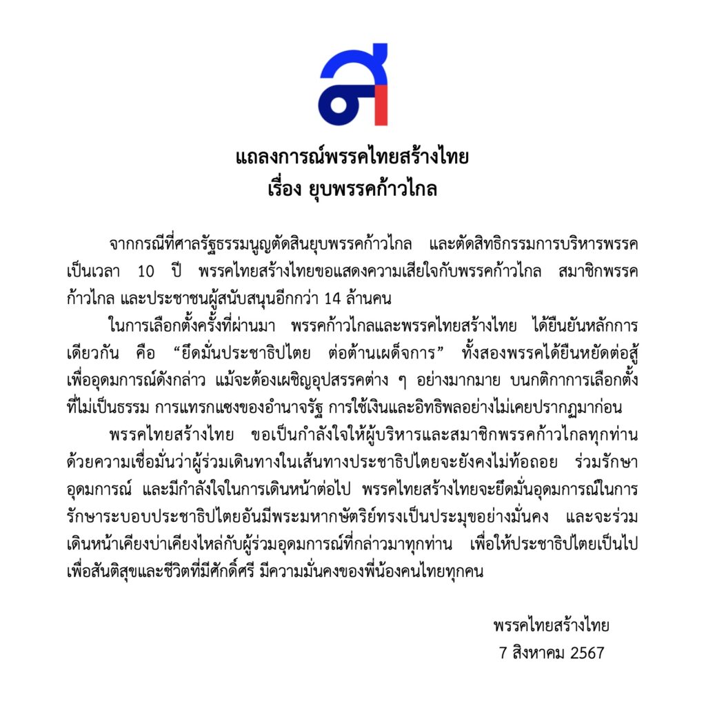 จากกรณีที่ศาลรัฐธรรมนูญตัดสินยุบพรรคก้าวไกล และตัดสิทธิกรรมการบริหารพรรคเป็นเวลา 10 ปี พรรคไทยสร้างไทยขอแสดงความเสียใจกับพรรคก้าวไกล สมาชิกพรรคก้าวไกล และประชาชนผู้สนับสนุนอีกกว่า 14 ล้านคน
