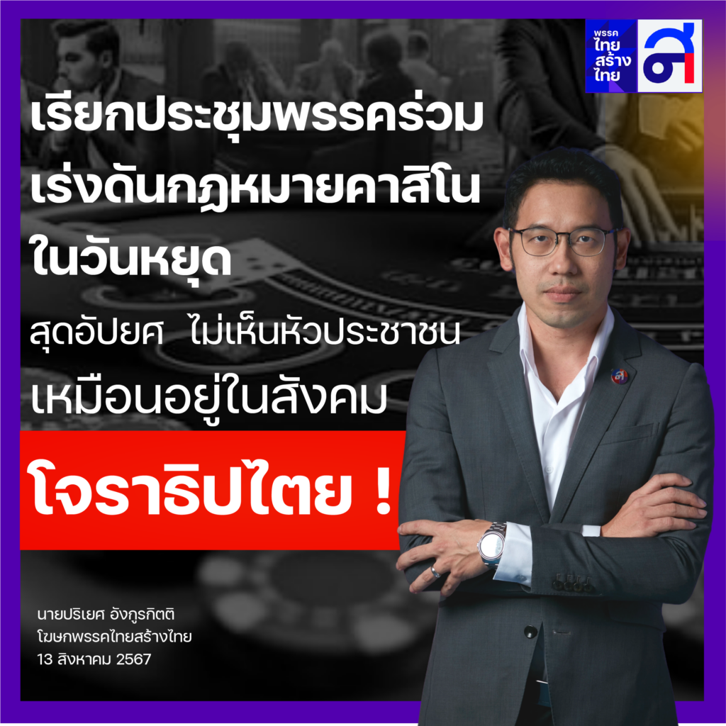 นายปริเยศ อังกูรกิตติ โฆษกพรรคไทยสร้างไทย ออกโรงถล่มนายภูมิธรรม เวชยชัย ในฐานะแกนนำพรรคเพื่อไทย หลังมีการเรียกประชุมด่วนพรรคร่วมรัฐบาล ถึงการผลักดันกฏหมายคาสิโน ทั้งที่เป็นวันหยุดว่า แม้รัฐมนตรีจะกล่าวว่าเป็นการประชุมที่วางไว้ เพราะเจ้าตัวติดภารกิจไปต่างประเทศในวันที่ 13 สิงหาคม และเป็นการประชุมในฐานะพรรคร่วมรัฐบาล แต่การใช้ทำเนียบรัฐบาลเป็นที่ประชุมอย่างรีบเร่ง จึงถือว่าเป็นการประชุมในฐานะ ครม. ซึ่งหากดูสถานการณ์ในเวลานี้ ตนเองไม่เข้าใจว่า ตอนนีชาวบ้านเผชิญปัญหาสินค้าราคาแพงทั้งแผ่นดิน แถมยังเจอปัญหาด้านการทำมาหากินที่ต่างประเทศเข้ามาแย่งตลาดในเมืองไทยทั้งออฟไลน์ ออนไลน์ ซึ่งเป็นเรื่องที่ประชาชนได้ผลกระทบโดยตรง แต่รัฐมนตรีดันเปิดทำเนียบผลักดันคาสิโน ที่ประเทศได้ค่าใบอนุญาตแค่ปีละพันล้าน แถมประชาชนคนไทยก็ยังไม่มั่นใจด้วยว่าจะเจอปัญหาอื่นๆตามมา ทั้งปัญหาสังคม รวมถึงมาเฟียที่แทรกซึมอยู่ในประเทศเต็มไปหมดหรือไม่ในเวลานี้ ตนจึงไม่เข้าใจว่ารัฐบาลเพื่อไทยใช้อะไรคิด หรือเป็นความคิดของรองนายกเพียงคนเดียว