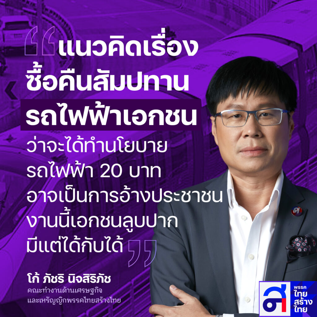 “ถ้ารัฐยอมจ่ายสูงซื้อคืนกลับมา มันก็เหมือนเอื้อนายทุนเจ้าของรถไฟฟ้า เพราะตามสัญญากว่าจะได้เงินทุนคืนมันนาน แต่อยู่ๆรัฐมาเวนคืนในระยะเวลาอันสั้น เอกชนลูบปากสบายเลย เมื่อรัฐได้สิทธิบริหาร แน่นอนกำหนดค่าตั๋วเท่าใดก็ได้ เช่น20บาทตลอดสาย แต่หากทำไปแล้วขาดทุน สุดท้ายอาจเหมือน ขสมก.หรือ การรถไฟ ที่มีหนี้สะสมมหาศาล” นายภัชริ กล่าว