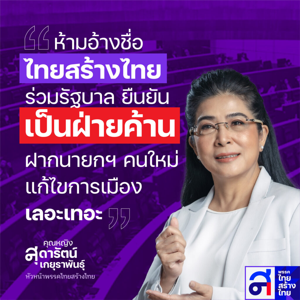 คุณหญิงสุดารัตน์ เกยุราพันธุ์ หัวหน้าพรรคไทยสร้างไทย โพสต์ข้อความผ่านทาง เฟซบุ๊ก โดยยืนยันถึงจุดยืนของพรรคไทยสร้างไทยว่า พรรคไทยสร้างไทย จะขอทำหน้าที่เป็นฝ่ายค้าน เพื่อตรวจสอบรัฐบาลชุดนี้ โดยระบุข้อความดังนี้