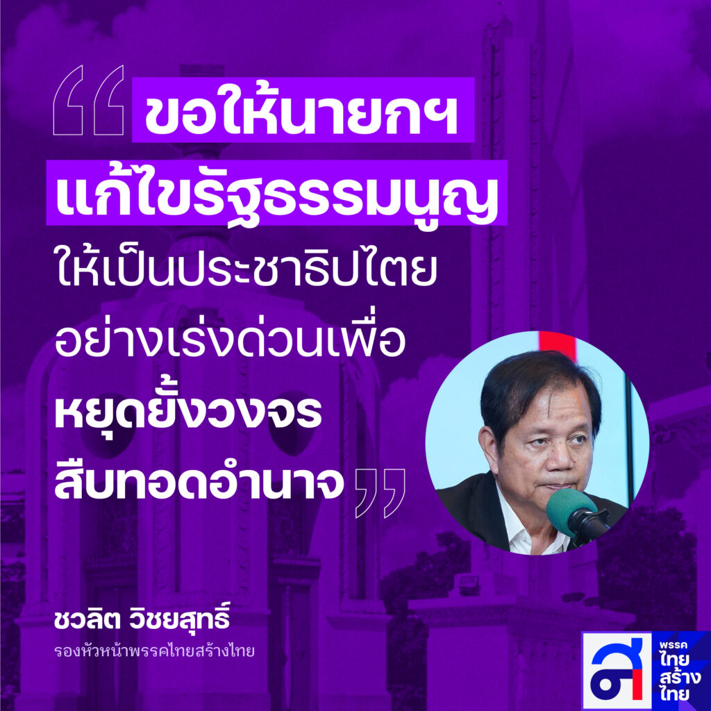 นายชวลิต วิชยสุทธิ์ รองหัวหน้าพรรค และกรรมการยุทธศาสตร์พรรคไทยสร้างไทยให้ความเห็นหลังมีพระบรมราชการโองการแต่งตั้งคณะรัฐมนตรีในรัฐบาลนางสาวแพทองธาร ชินวัตร นายกรัฐมนตรี ว่าได้ติดตามความเห็นทางการเมืองของประชาชนมาเป็นเวลานานพบว่า คนไทยอยากจะเห็นการแก้ไข รธน.ให้เป็นประชาธิปไตย เป็นรัฐธรรมนูญที่อำนาจอธิปไตยเป็นของปวงชนชาวไทยอย่างแท้จริง