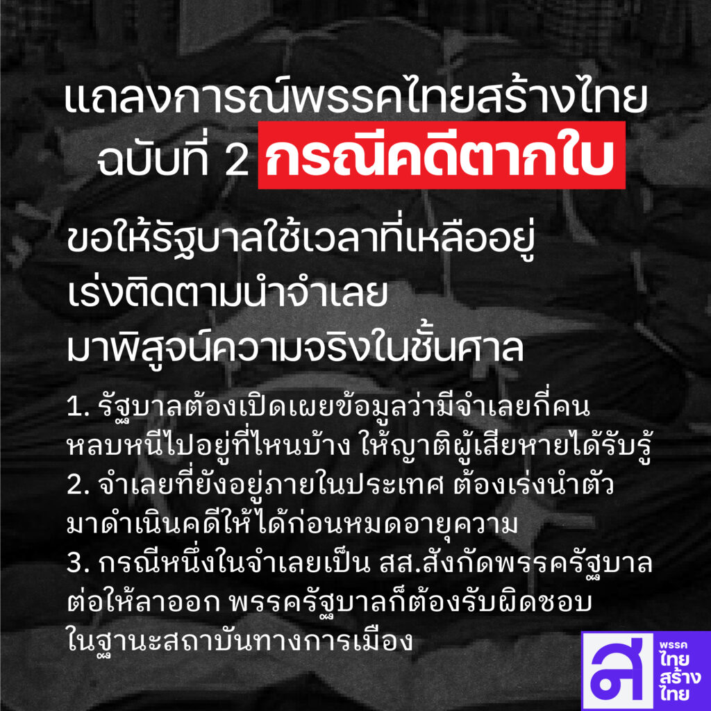 ดังนั้น แม้เวลาจะเหลือเวลาไม่ถึงหนึ่งสัปดาห์คดีจะขาดอายุความ พรรคไทยสร้างไทยขอเรียกร้องให้รัฐบาลใช้เวลาที่เหลืออย่างสุดความสามารถในการติดตามตัว “จำเลย” มาดำเนินคดีตามกระบวนการยุติธรรม ดังนี้