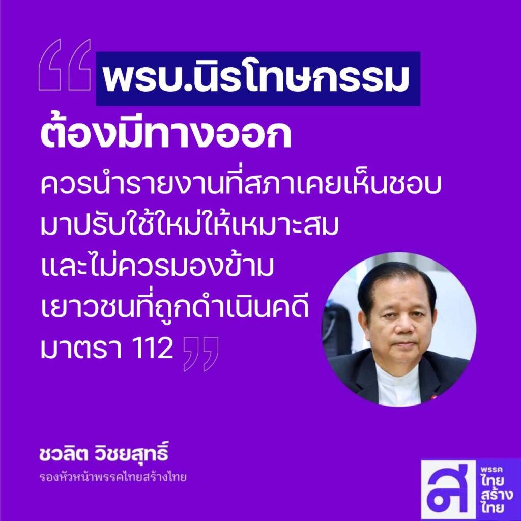 นายชวลิต วิชยสุทธิ์ รองหัวหน้าพรรคให้ความเห็นต่อปัญหาการนิรโทษกรรมซึ่งสภาผู้แทนราษฎรในคราวประชุมเมื่อวันที่ 24 ต.ค.67 มีมติ “ไม่เห็นชอบ” กับข้อสังเกตของคณะกรรมาธิการวิสามัญพิจารณาศึกษาแนวทางการตรา พ.ร.บ.นิรโทษกรรม ที่ได้เสนอทางเลือกการนิรโทษกรรมความผิดตาม ม.112 ไว้ 3 ทางเลือก นั้น