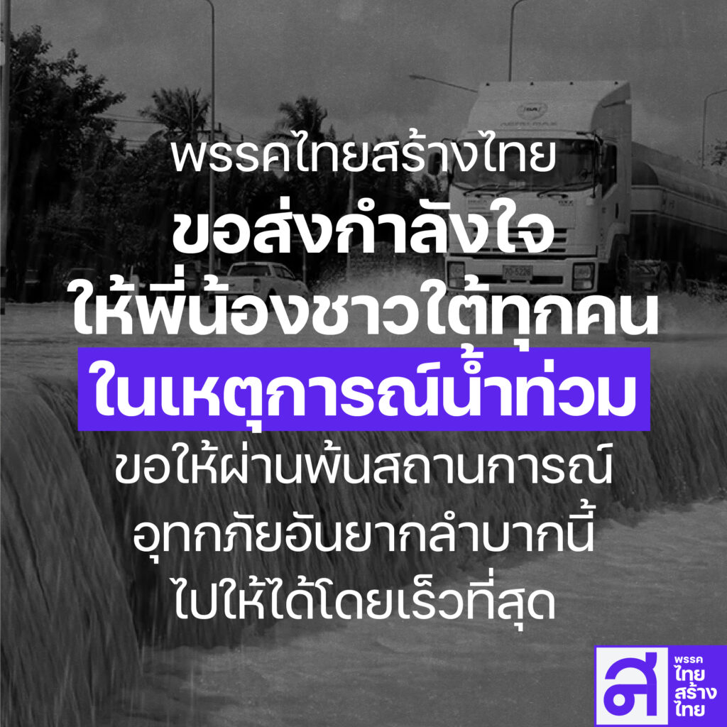 พรรคไทยสร้างไทย ขอแสดงความห่วงใย พี่น้องประชาชนในพื้นที่ภาคใต้ที่กำลังประสบกับอุทกภัย เนื่องจากฝนที่ตกลงมาอย่างหนัก จากข้อมูลพบว่า ปริมาณน้ำฝนสะสม สูงถึง 380-524 มิลลิเมตร/วัน ส่งผลกระทบต่อพี่น้องประชาชนเป็นวงกว้างไม่ว่าจะเป็นพัทลุง สงขลา ปัตตานี นราธิวาส ยะลา และสตูล จนเกิดน้ำล้นตลิ่ง กระทบพื้นที่อยู่อาศัย รวมถึงพื้นที่ชุมชนย่านเศรษฐกิจ