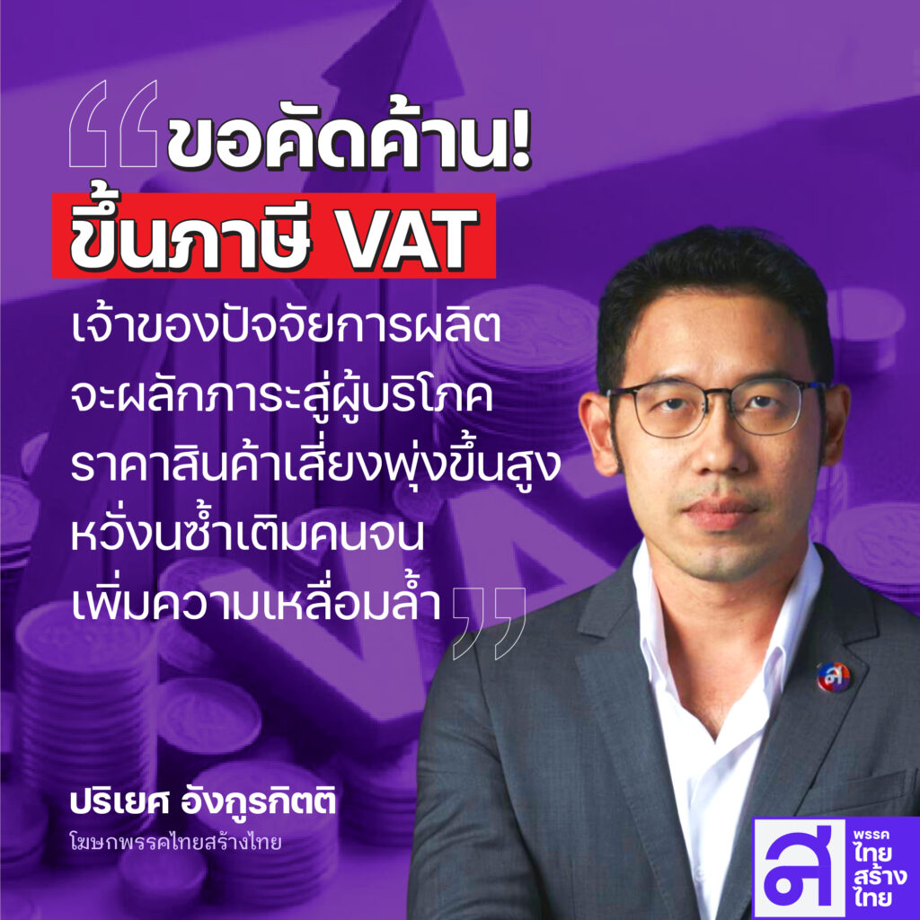 นายปริเยศ อังกูรกิตติ โฆษกพรรคไทยสร้างไทยให้ความเห็นกรณี รัฐบาลเพื่อไทยมีแนวคิดการปรับขึ้น ภาษีมูลค่าเพิ่ม จนถูกวิพากษ์วิจารณ์อยู่ในขณะนี้ว่า สถานการณ์การหารายได้ เข้าคลัง ของรัฐบาล ที่มีแนวโน้มต่ำกว่าที่คาดการณ์ จึงเป็นที่มา ที่จะต้อง เพิ่มรายได้ อย่างเร่งด่วน ประกอบกับการขึ้นภาษีมูลค่าเพิ่ม มีการเตรียมการเอาไว้ล่วงหน้าก่อนแล้ว ที่ตัวเลข 10% ดังนั้น จึงเป็นเหมือนการโยนหินถามทางสำหรับการให้ความเห็นดังกล่าวของรัฐมนตรีว่าการกระทรวงการคลัง