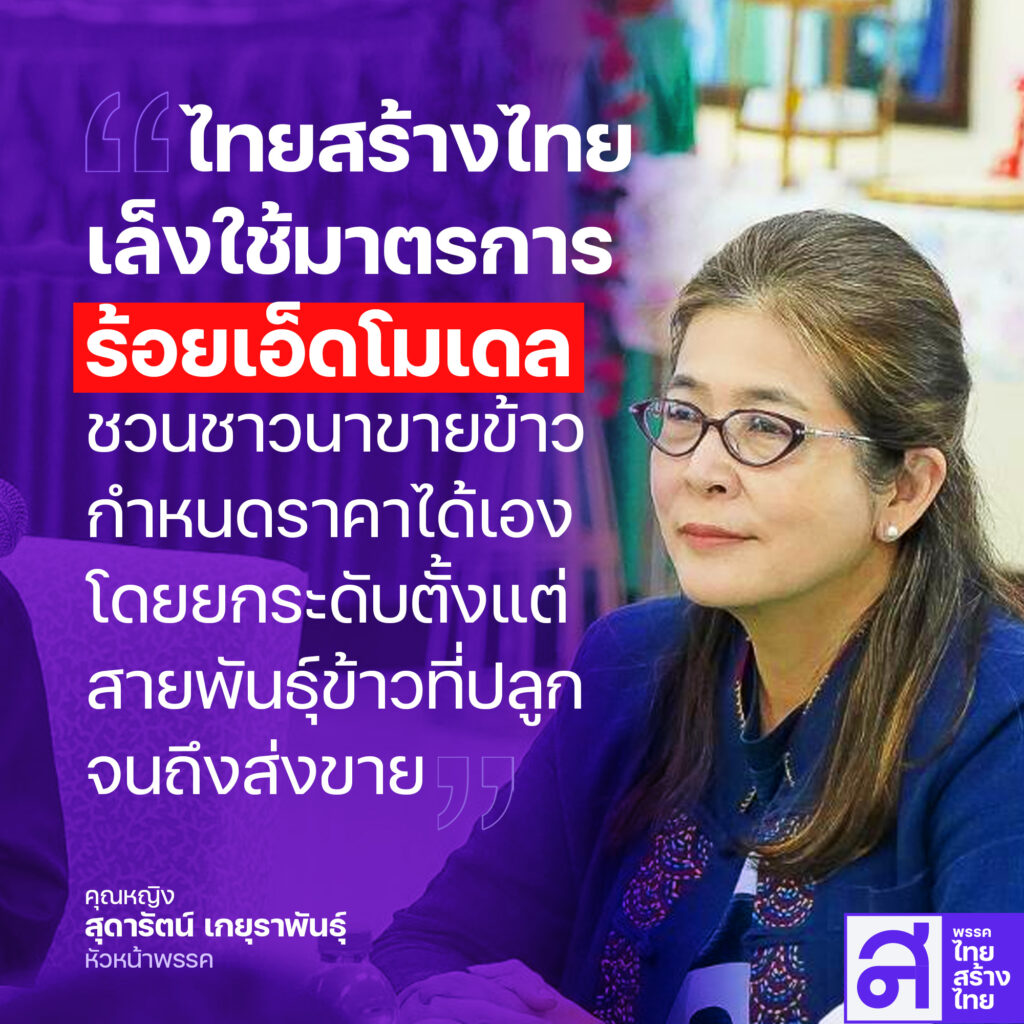 พรรคไทยสร้างไทย จึงใช้จังหวัดร้อยเอ็ดเป็นโมเดล ในการยกระดับราคาผลผลิตทางการเกษตร โดยเฉพาะราคาข้าวให้สูงขึ้น ให้พี่น้องเกษตรกรสามารถอยู่ได้อย่างมีศักดิ์ศรี เปลี่ยนจากการขายข้าวเปลือก มาสู่ยุคที่ชาวนาขายข้าวสาร โดยจะให้พี่น้องชาวนารวมกลุ่มเพื่อสร้างความเข้มแข็ง นำเครื่องไม้เครื่องมือเข้าไปช่วยสนับสนุน การทำนาตั้งแต่เริ่มการผลิต การสร้างองค์ความรู้ เพื่อพัฒนาพันธุ์ข้าวให้มีคุณภาพไปสู่พี่น้องชาวนา พร้อมสนับสนุนเครื่องมือสำหรับการเก็บเกี่ยว การสีข้าว จนถึงการพัฒนาบรรจุภัณฑ์ บรรจุข้าวสาร ซึ่งจะทำให้ ชาวนาสามารถขายข้าวสารได้ในราคาที่ตนเองเป็นผู้กำหนด ทั้งยังเพิ่มผลผลิตต่อไร่ให้สูงขึ้นด้วย จากที่เคยขายข้าวเปลือกได้ราคา 10 บาทถึง 13 บาทต่อกิโลกรัม เมื่อหันมาขายข้าวสารที่มีคุณภาพ ก็จะได้ราคาสูง 30-40 บาทต่อกิโลกรัม