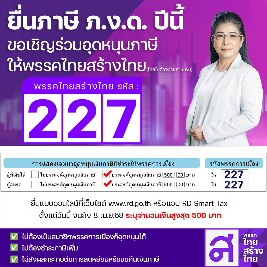 ✨ ท่านสามารถยื่นภาษีไปพร้อมกับการสนับสนุนพรรคไทยสร้างไทย ด้วยการอุดหนุนภาษีให้ #พรรคไทยสร้างไทย จำนวน 500 บาท (โดยไม่ต้องชำระภาษีเพิ่ม) เพียงกรอกรหัสพรรคไทยสร้างไทย 227 ในแบบฟอร์มแบบภาษีเงินได้บุคคลธรรมดา (ภ.ง.ด. 90-91) ทั้งทางออนไลน์และออฟไลน์