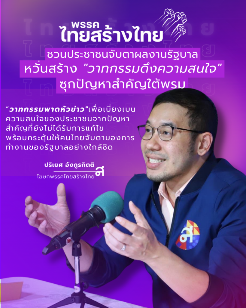 นายปริเยศ อังกูรกิตติ โฆษกพรรคไทยสร้างไทย แสดงความเห็นต่อการทำงานของรัฐบาล โดยชี้ว่ารัฐบาลกำลังใช้ “วาทกรรมพาดหัวข่าว” เพื่อเบี่ยงเบนความสนใจของประชาชนจากปัญหาสำคัญที่ยังไม่ได้รับการแก้ไข พร้อมกระตุ้นให้คนไทยจับตามองการทำงานของรัฐบาลอย่างใกล้ชิด